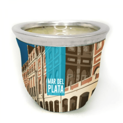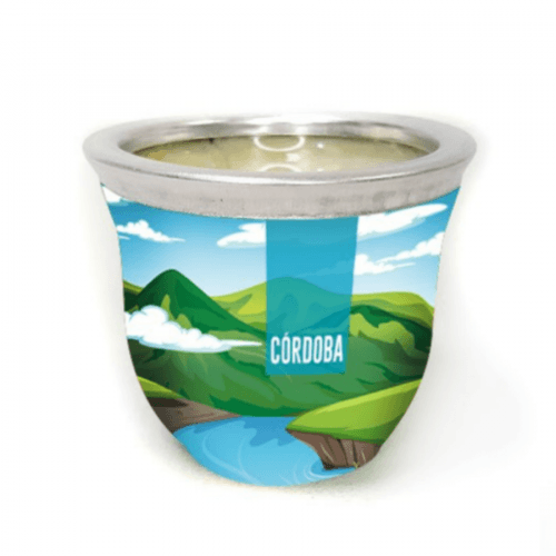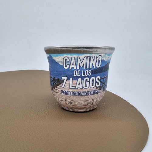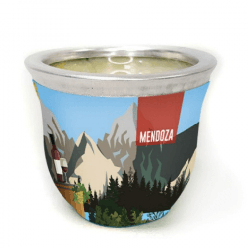 Mate de vidrio forrado con cuerina impresa y virola de aluminio