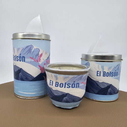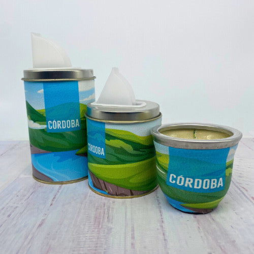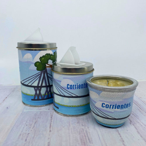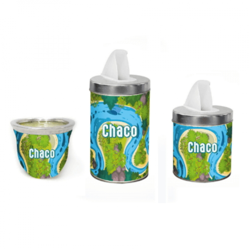 Set yerbera y azucarera de hojalata forrada con cuerina impresa. Viene con pico vertedor de plástico.